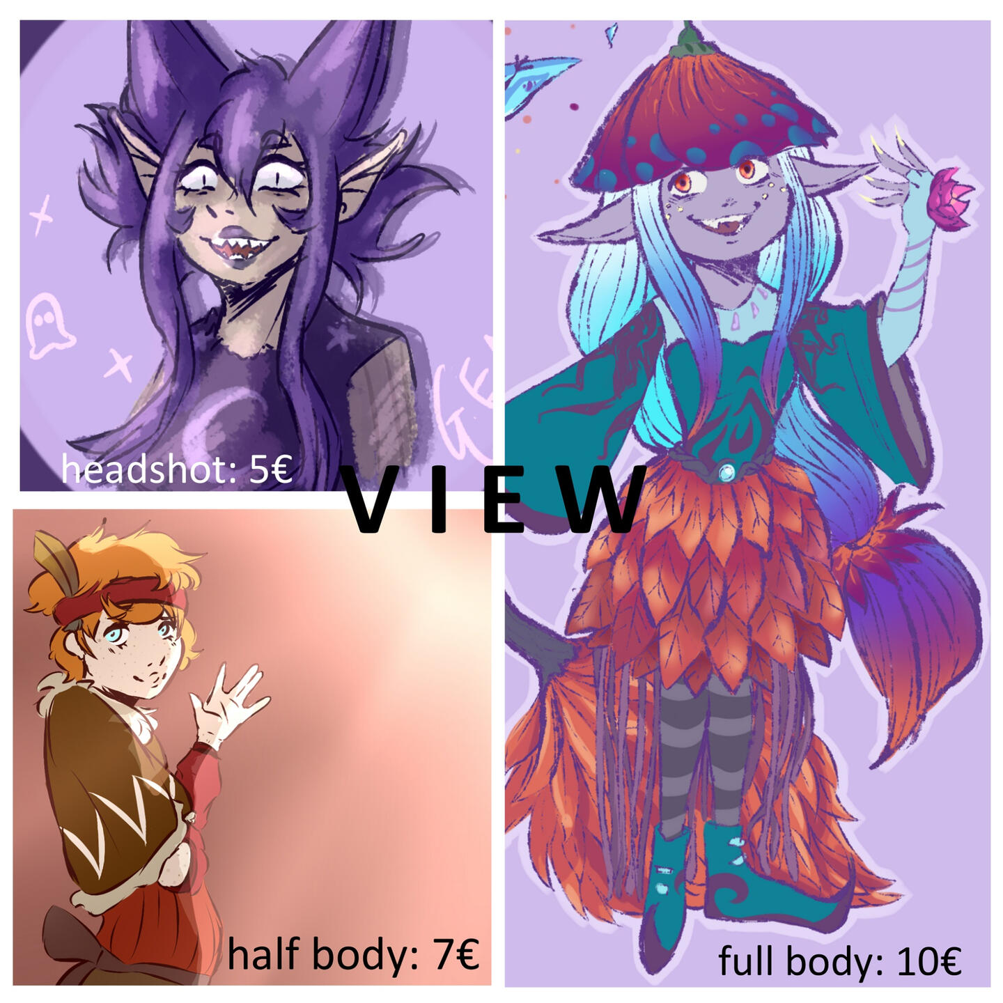 coloured full body (front)colourless full body (back)colourless headshot for extra expressioncoloured headshot (sideview) (optional)coloured extras (like items etc.) +5€